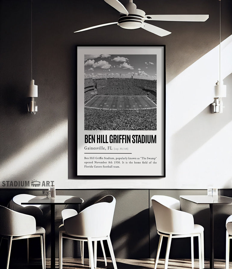 Ben Hill Griffin Stadium Print, Florida Gators Poster/Canvas, Seat View (v2), B&W Modern Art, Football Wall Art Decor, Game Day Keepsake