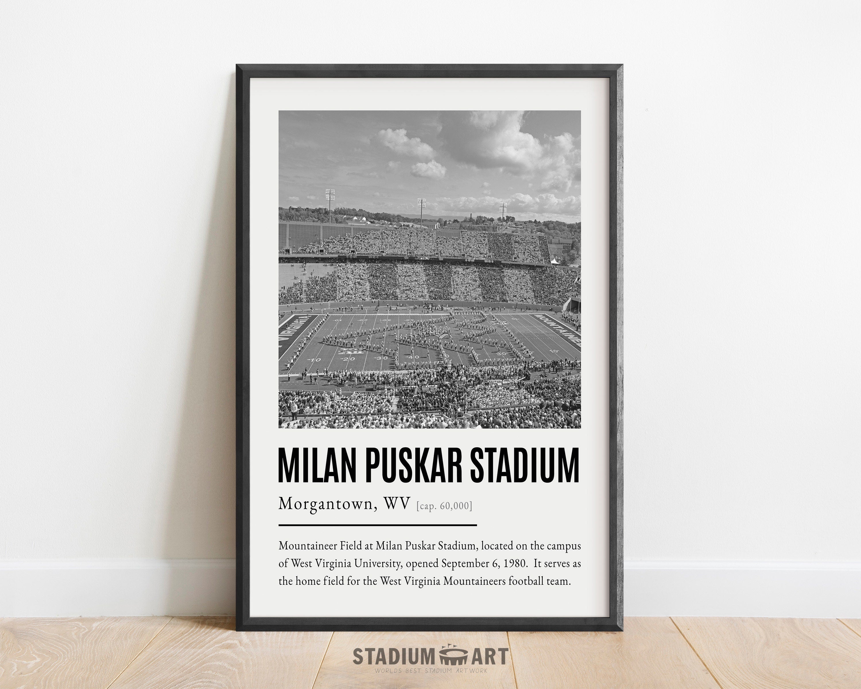 Milan Puskar Stadium Print, Virginia Mountaineers Poster/Canvas, Seat View, B&W Modern Football Wall Art Decor, Game Day Keepsake