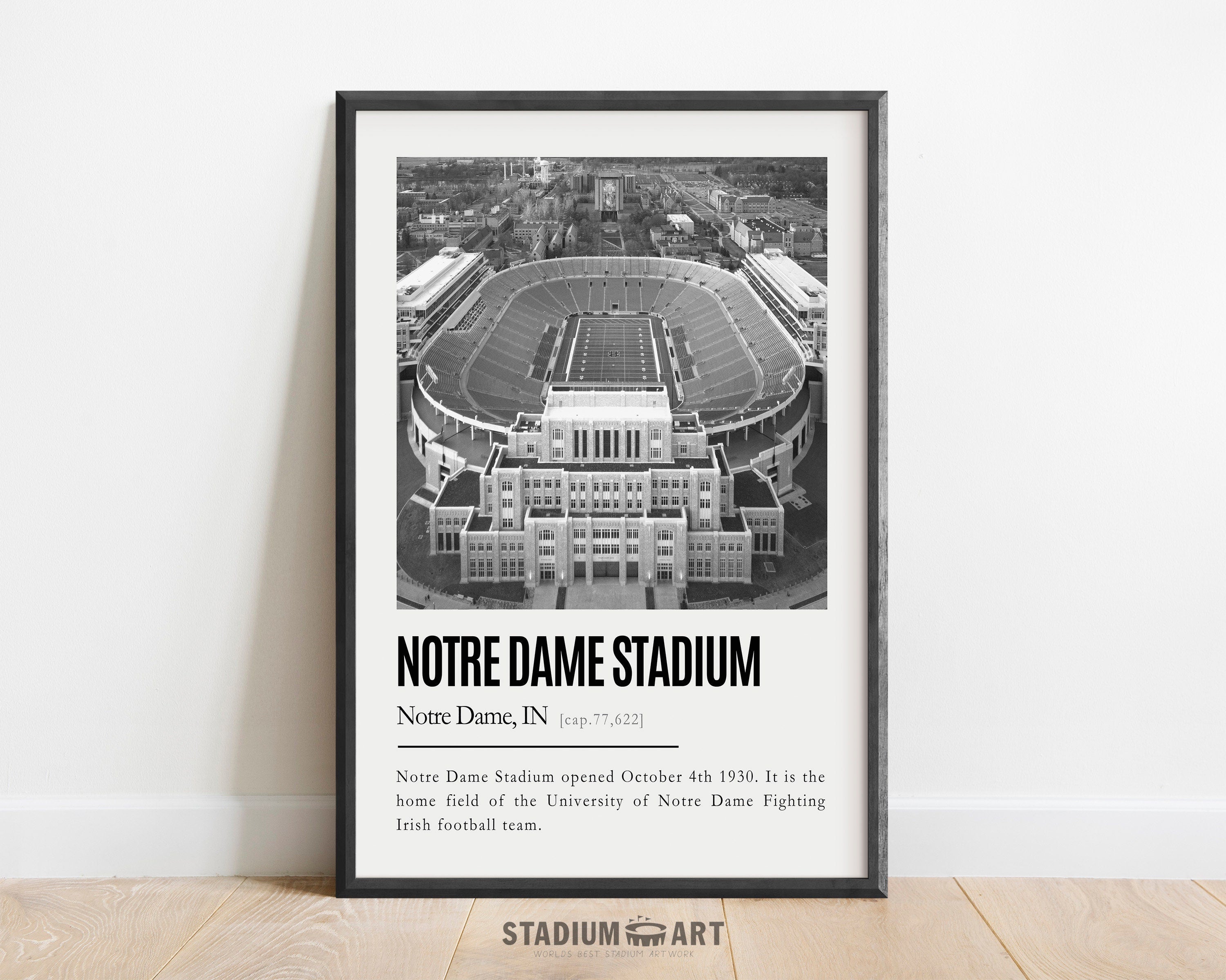 Notre Dame Stadium Print, Notre Dame Fighting Irish Poster/Canvas, Aerial View, B&W Modern Football Wall Art Decor, Game Day Keepsake