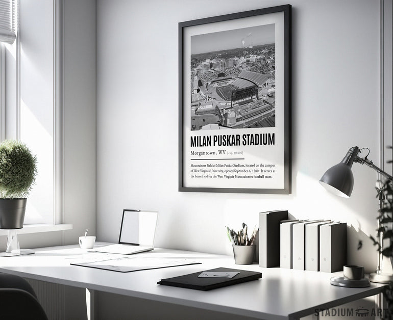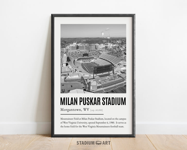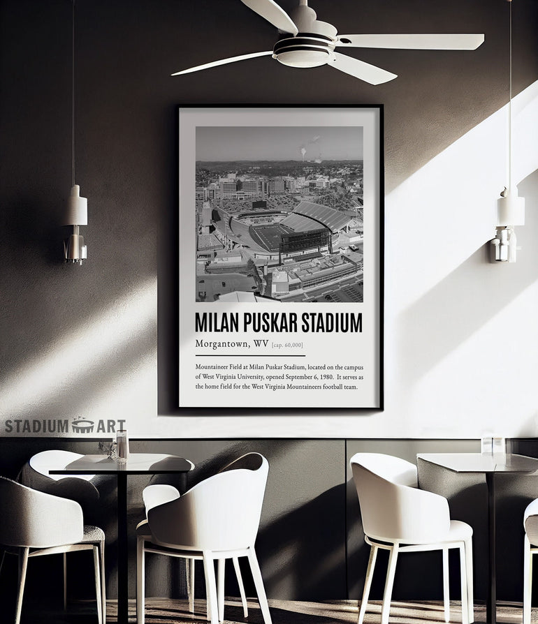 Milan Puskar Stadium Print, Virginia Mountaineers Poster/Canvas, Aerial View, B&W Modern Football Wall Art Decor, Game Day Keepsake