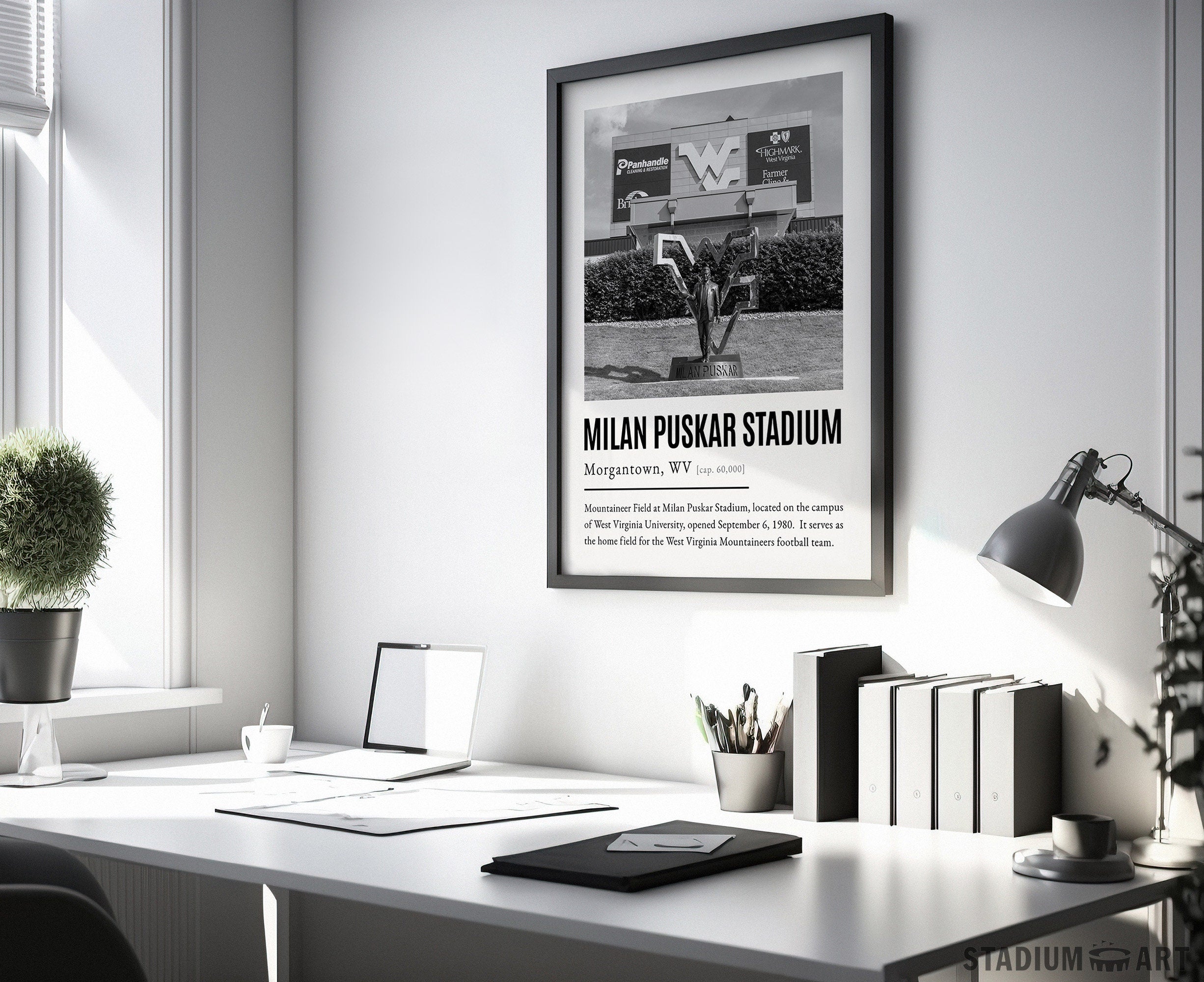 Milan Puskar Stadium Print, Virginia Mountaineers Poster/Canvas, Street View, B&W Modern Football Wall Art Decor, Game Day Keepsake